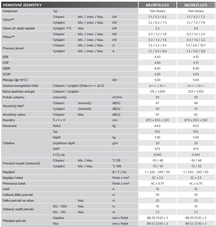 Venkovní jednotky LG MU3R19.U23 a MU3R21.U23 umožňují připojení až tří vnitřních jednotek s různým výkonem v rámci jednoho systému. Díky invertorové technologii Dual Inverter Compressor™ nabízejí úsporný a tichý provoz s plynulým řízením výkonu.